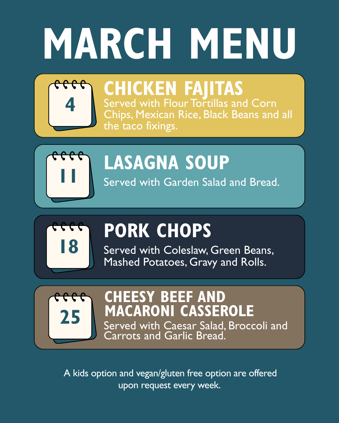 A kids option and vegan/gluten free option are offered upon request every week.